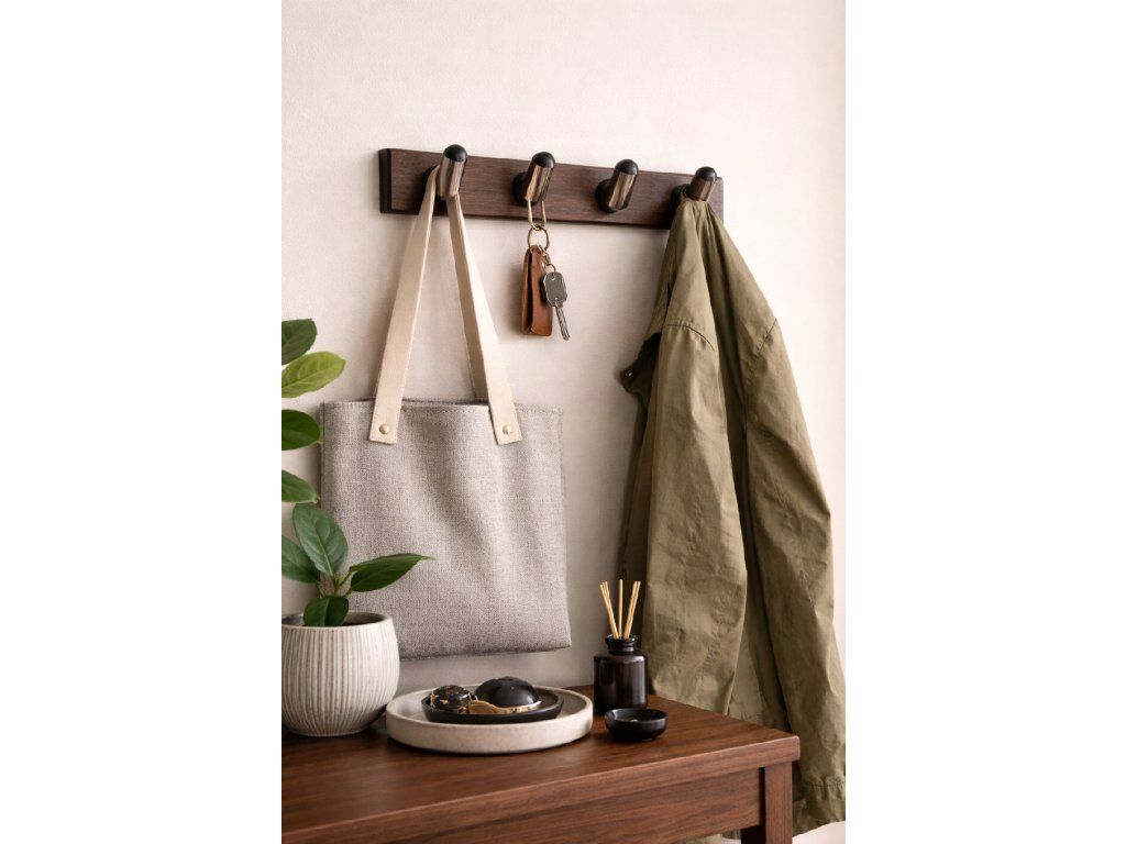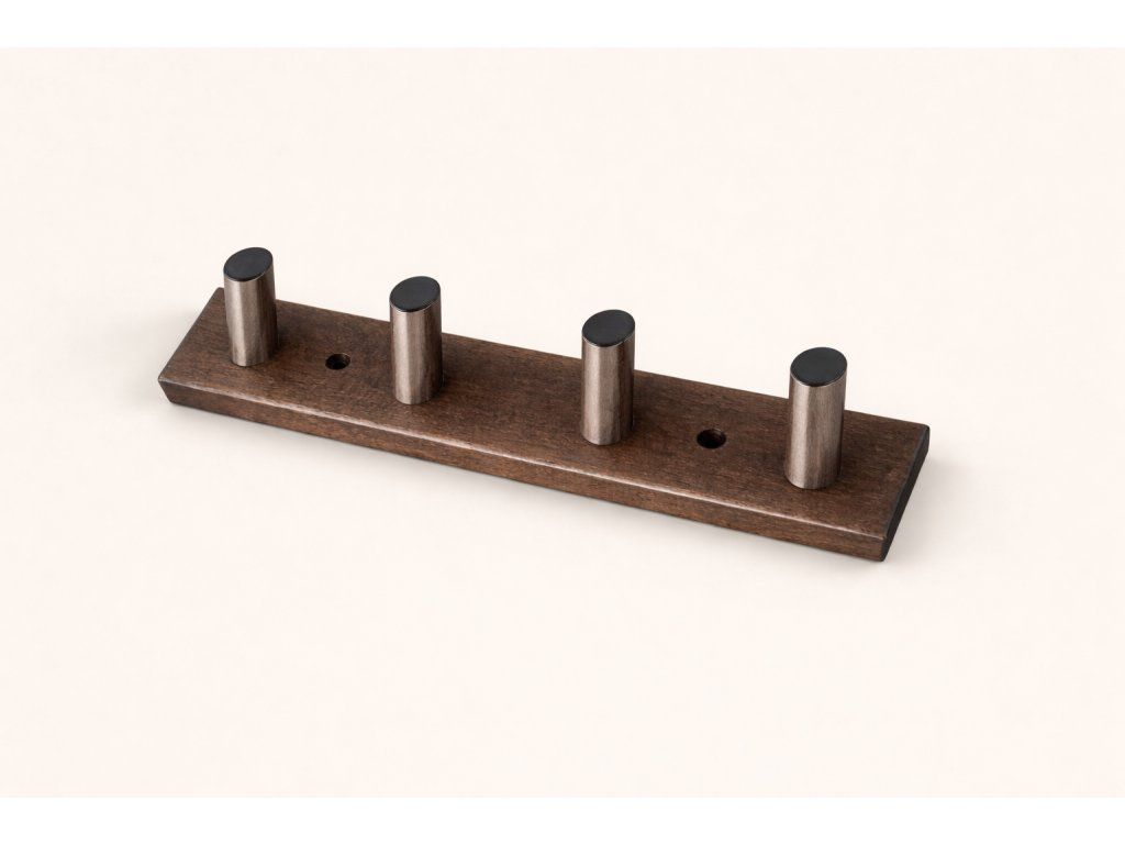 Stylový nástěnný věšák z masivního dřeva v tmavém moření. Jednoduchý a čistý design vynikne v moderním i přírodně laděném interiéru. Praktický pomocník na kabáty, tašky i doplňky.