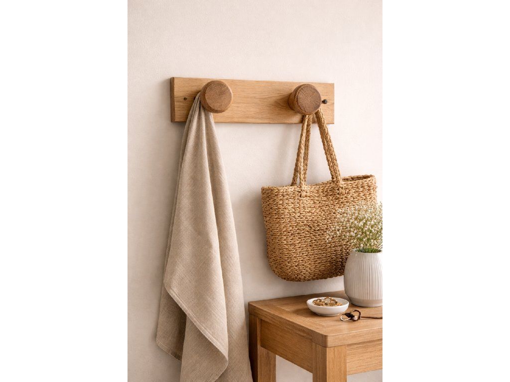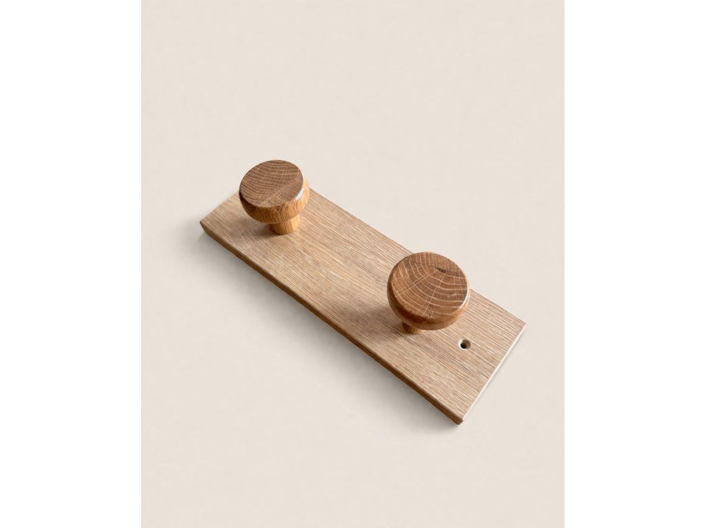 Jednoduchý nástěnný věšák z masivního dřeva doplněný o dva výrazné kulaté háčky. Díky čistému tvaru a přirozené kresbě dřeva působí nenápadně, ale zároveň stylově. Ideální do předsíně, ložnice i dětského pokoje – na kabáty, tašky nebo drobnosti, které chcete mít po ruce.